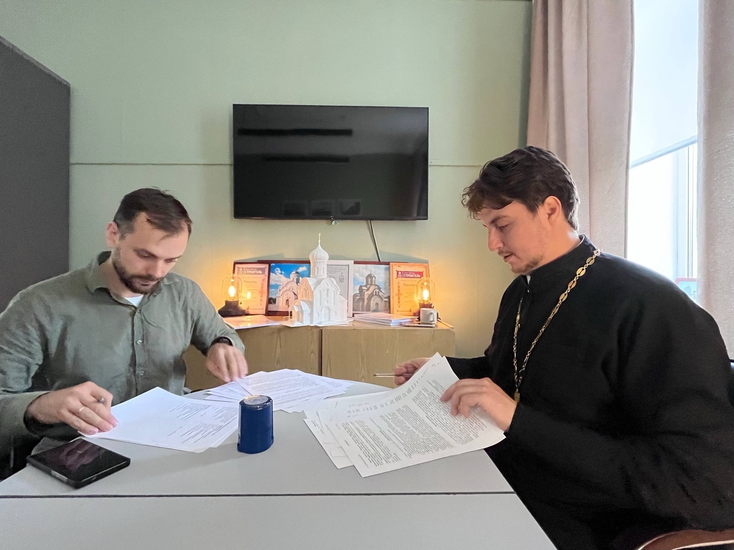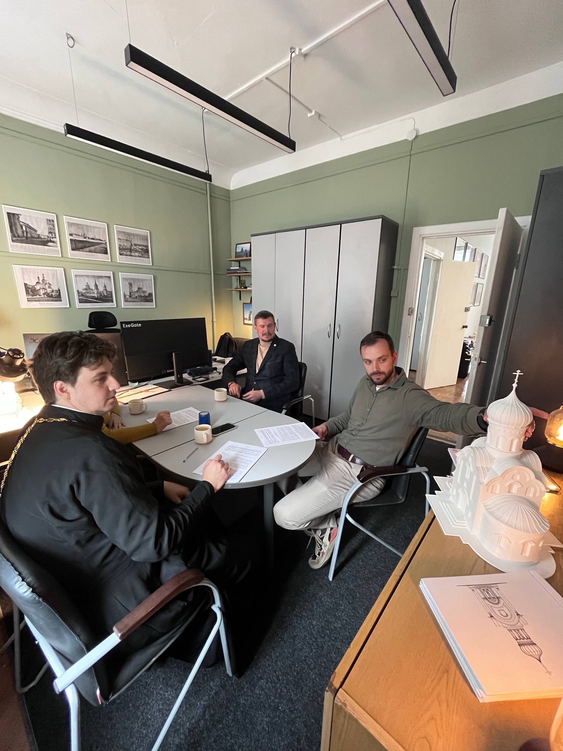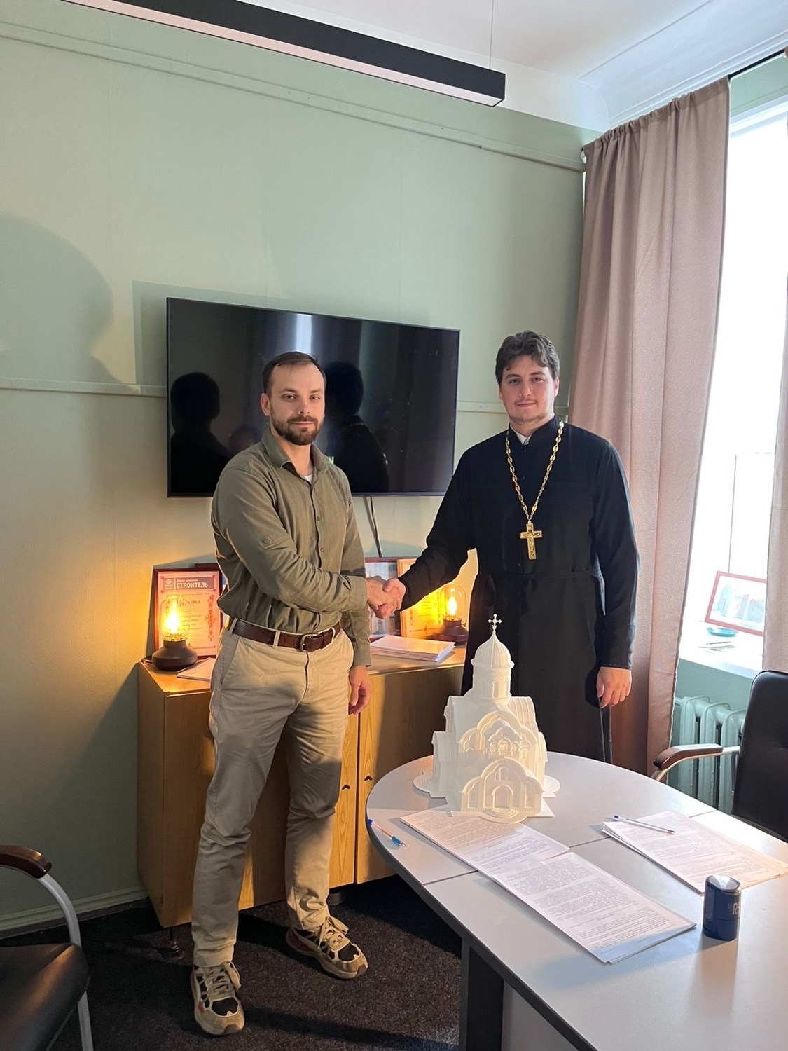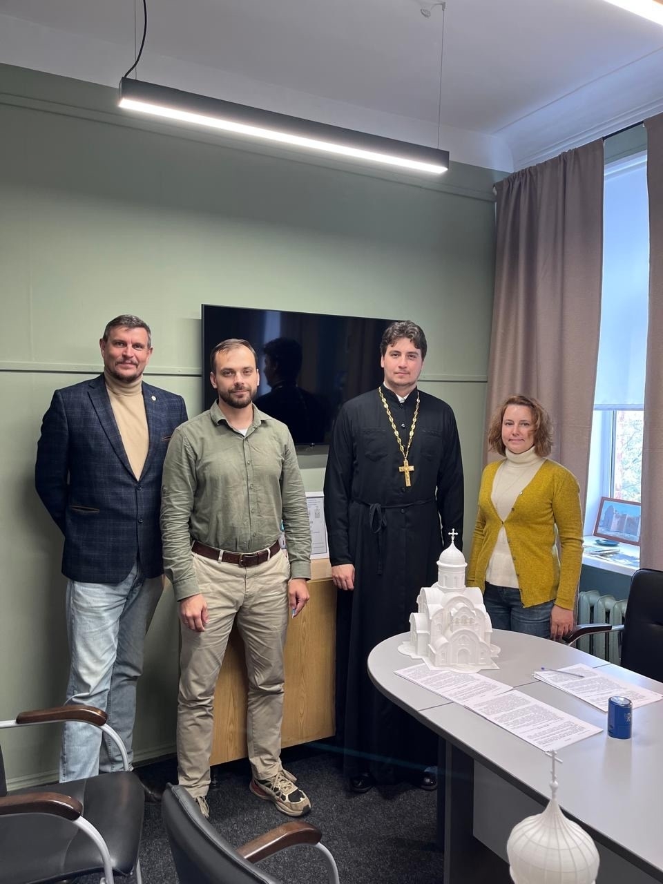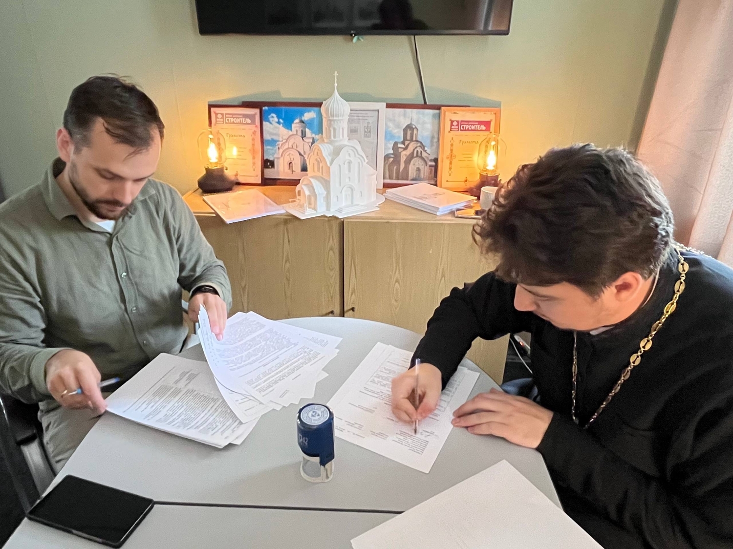 Подписание итогового Договора о проектировании храмового комплекса в честь святых Новомучеников и исповедников Церкви Русской в городе Угличе. На фото:настоятель строящегося храма священник Антоний Зверков (Переславская епархия),Председатель Попечительского совета храма Пенягина Галина Александровна, главный архитектор проекта Барханов Вадим Евгеньевич и директор по строительству Рукавишников Сергей Леонидович