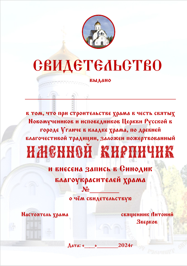 2. Ваше имя (или имена) наносится на одном из кирпичей будущего храма.